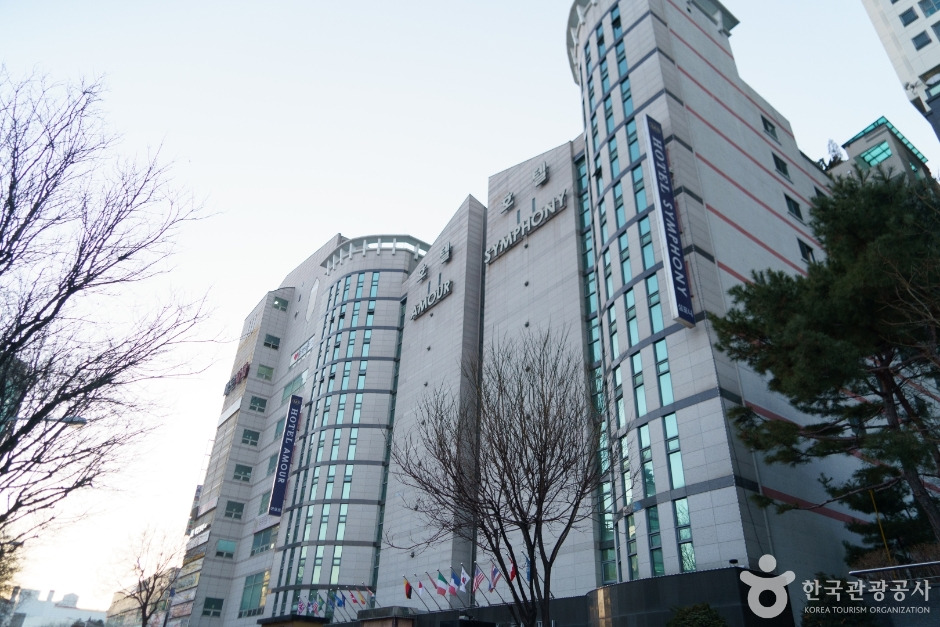 아모르앤심포니호텔은 똑같이 생긴 건물 외관이 붙어 있는 아모르호텔과 심포니호텔 2동이 있는 고품격 비즈니스 호텔이다. 128여 개의 현대적인 객실과 아모르호텔과 심포니호텔이 동시 이용 가능한 로비와 조식 뷔페 식당, 소회의 및 미팅이 가능한 세미나실과 컨퍼럼스 룸, 셀프 세탁실, 미니 헬스룸, 비즈니스 코너 등이 있어 호텔 이용 투숙객의 편리함을 도모한다. 최신의 설비와 업무 지원 시스템을 갖추고 있어 객실 내에서 모든 비즈니스 업무를 손쉽게 처리할 수 있으며 추가 요금으로 조식도 가능하다. 도보로 3분 이내에 홈플러스와 영통 중심가가 있고 광교호수공원, 수원화성, 월드컵경기장 등 다양한 관광 명소가 있다.