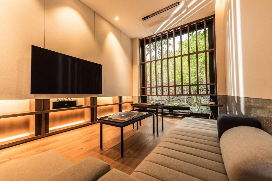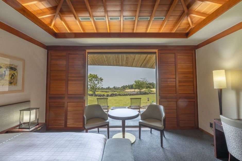세계적 건축 거장 이타미 준의 예술 작품이자, 제주 아름다운 7대 건축물로 선정된 포도호텔은 26개 객실로 운영된다. 제주의 오름과 초가집을 모티브로 만들어져 하늘에서 내려다보니 한 송이의 포도 같다 하여 포도호텔이라 불리며, 객실은 한실과 양실로 나뉜다. 특히 한실은 한국 전통을 느낄 수 있는 천장의 서까래가 보인다. 또한 모든 창은 한지를 바른 격자무늬 창, 벽과 바닥은 황토로 시공한 후 옛 공법 그대로 한지에 콩기름을 입혀 마감하였다. 또한 양실은 단층인 점을 살려 천장을 높게 올림으로써 쾌적함을 느낄 수 있고, 체리 원목으로 실내를 구성하여 다양한 색감을 느낄 수 있다.