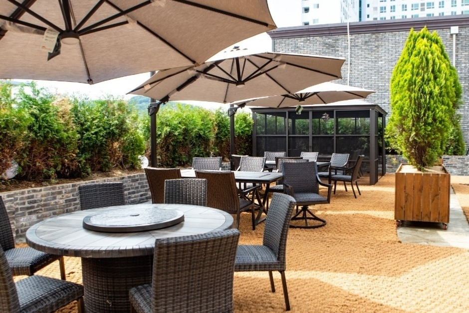 카페 데크에서 바라보는 연꽃과 연잎으로 뒤덮인 주봉저수지 전경, 논이 펼쳐지는 뒤뜰의 전경 등 여러 가지 분위기를 동시에 느낄 수 있다.