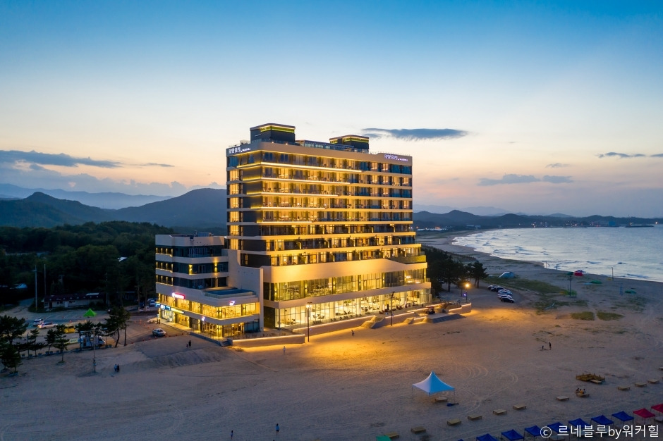 르네블루 by 워커힐은 강원도 고성군 죽왕면에 있는 숙박업소이다. 르네블루라는 상호는 벨기에 작가 이름인 ‘르네’와 파란색의 영어인 ‘블루’의 합성어이다. 작가가 작품을 만들어 내듯이 해변의 푸른 하늘과 투명한 바다가 작품을 만든다 하여 지어진 이름이다. 숙소 바로 앞이 송지호 해변이다. 총 객실 수는 87개로 모든 객실이 바다가 보이는 오션뷰이다. 지상층 진입공간은 켜켜이 쌓인 백사장 모래를 형상화했고, 저층부 테라스는 넘실대는 파도를 닮았다. 죽도의 대나무를 모티브로 해서 상층부를 디자인했다. 밤에 파란 조명이 들어오는 루프탑은 블루 스카이라 불린다. 연회장과 레스토랑, 비즈니스 룸 등의 부대시설이 있다.